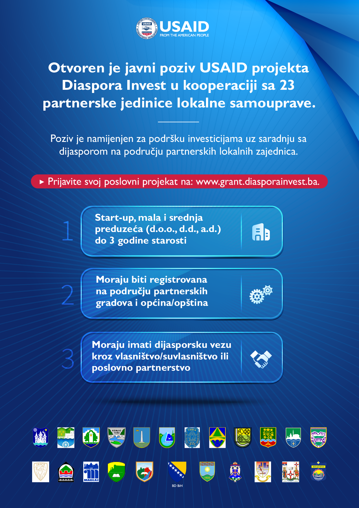 Poziv je otvoren u suradnji sa USAID projektom Diaspora Invest, s ciljem poticanja direktnih investicija uz suradnju sa dijasporom. Više o pozivu putem sljedećeg linka: https://www.fmi-inc.net/opportunities/municipal-diaspora-facility-small-grant-fund/