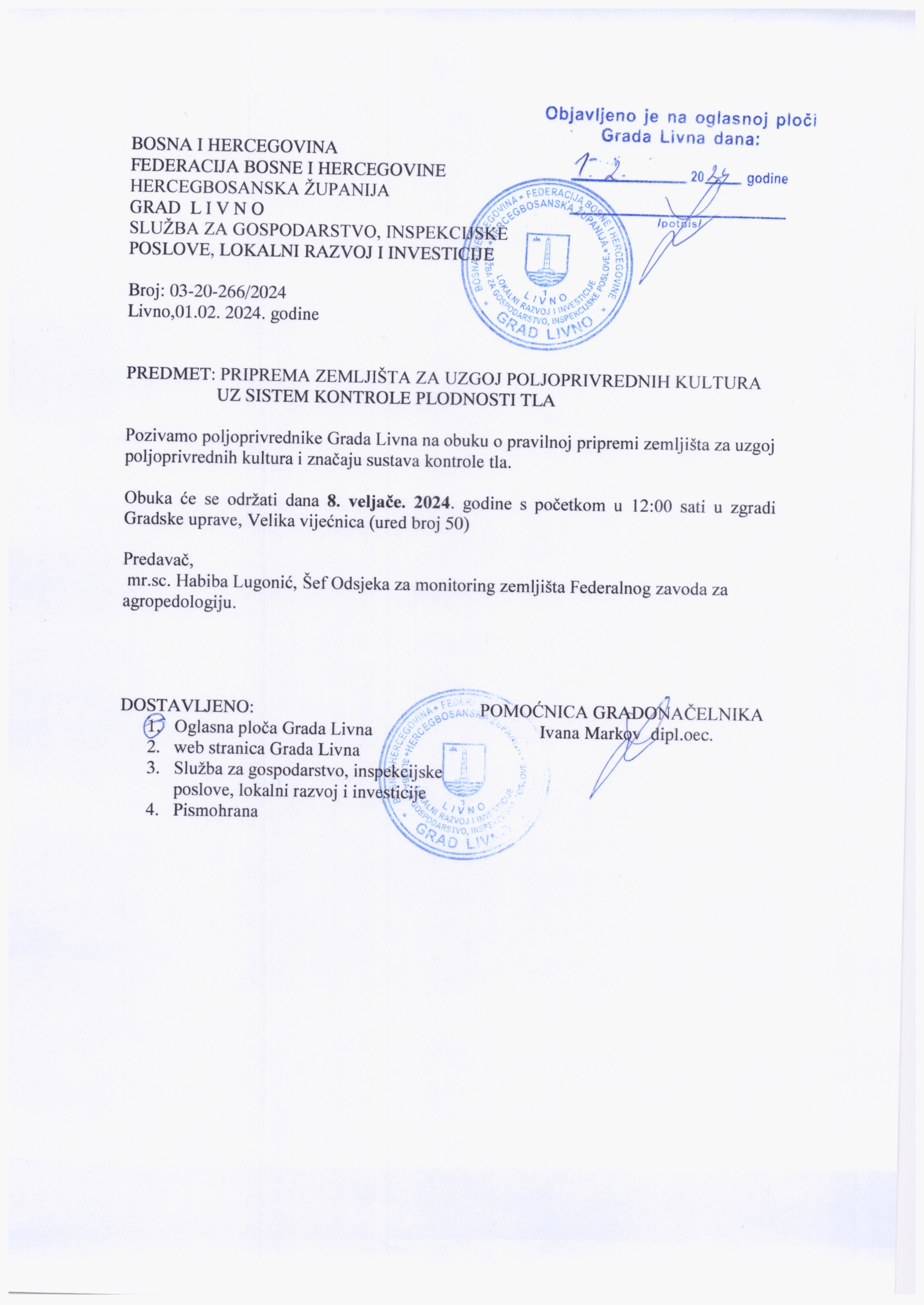 Iz Službe za gospodarstvo, inspekcijske poslove, lokalni razvoj i investicije Grada Livna pozivaju poljoprivrednike s područja Livna na obuku o temi pravilne pripreme zemljišta za uzgoj poljoprivrednih kultura i značaju sustava kontrole tla. Obuka će se održati 8. veljače 2024. u zgradi Gradske uprave Livna s početkom u 12 sati. Kompletan tekst obavijesti je u privitku.