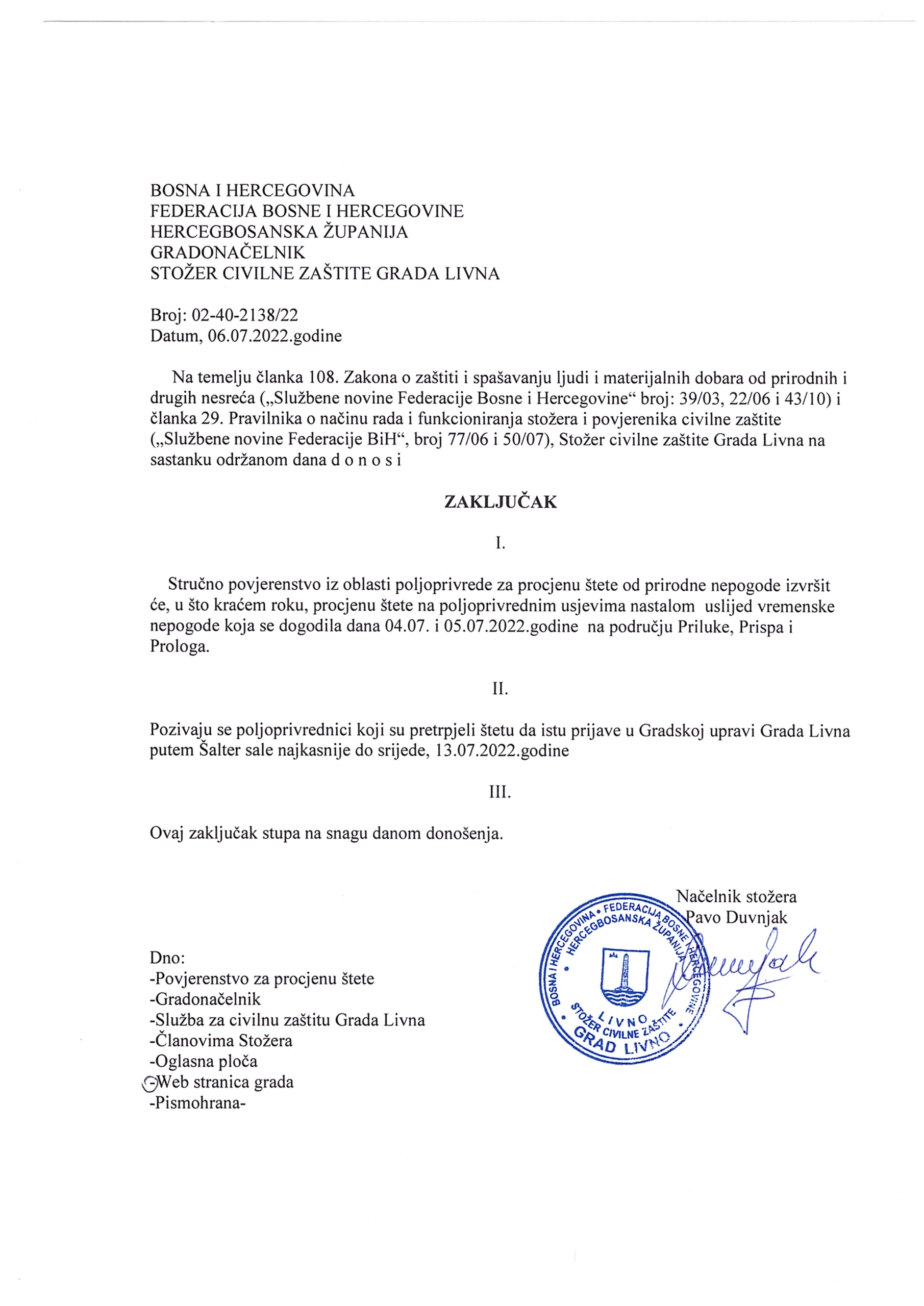 Prije nekoliko dana područje Livna, odnosno sela Priluku, Prisap i Prolog pogodilo je nevrijeme te na poljoprivrednim usjevima nanijelo štetu. Tim je povodom Stožer civilne zaštite Grada Livna održao sastanak na kojem je zaključeno da će stručno povjerenstvo iz oblasti poljoprivrede u što kraćem roku izvršiti procjenu štete nastale na usjevima. Potrebno je da poljoprivrednici iz svih mjesta s područja grada Livna koji su pretrpjeli štetu na poljoprivrednim usjevima tijekom nedavnog nevremena istu prijave Gradskoj upravi Livna putem prijemne šalter dvorane najkasnije do 13. srpnja 2022. Iz gradskog Stožera civilne zaštite ističu da, kako po ovim tako i drugim pitanjima, nastavlja kontinuirano raditi i djelovati sukladno ovlastima. U privitku je doneseni zaključak.