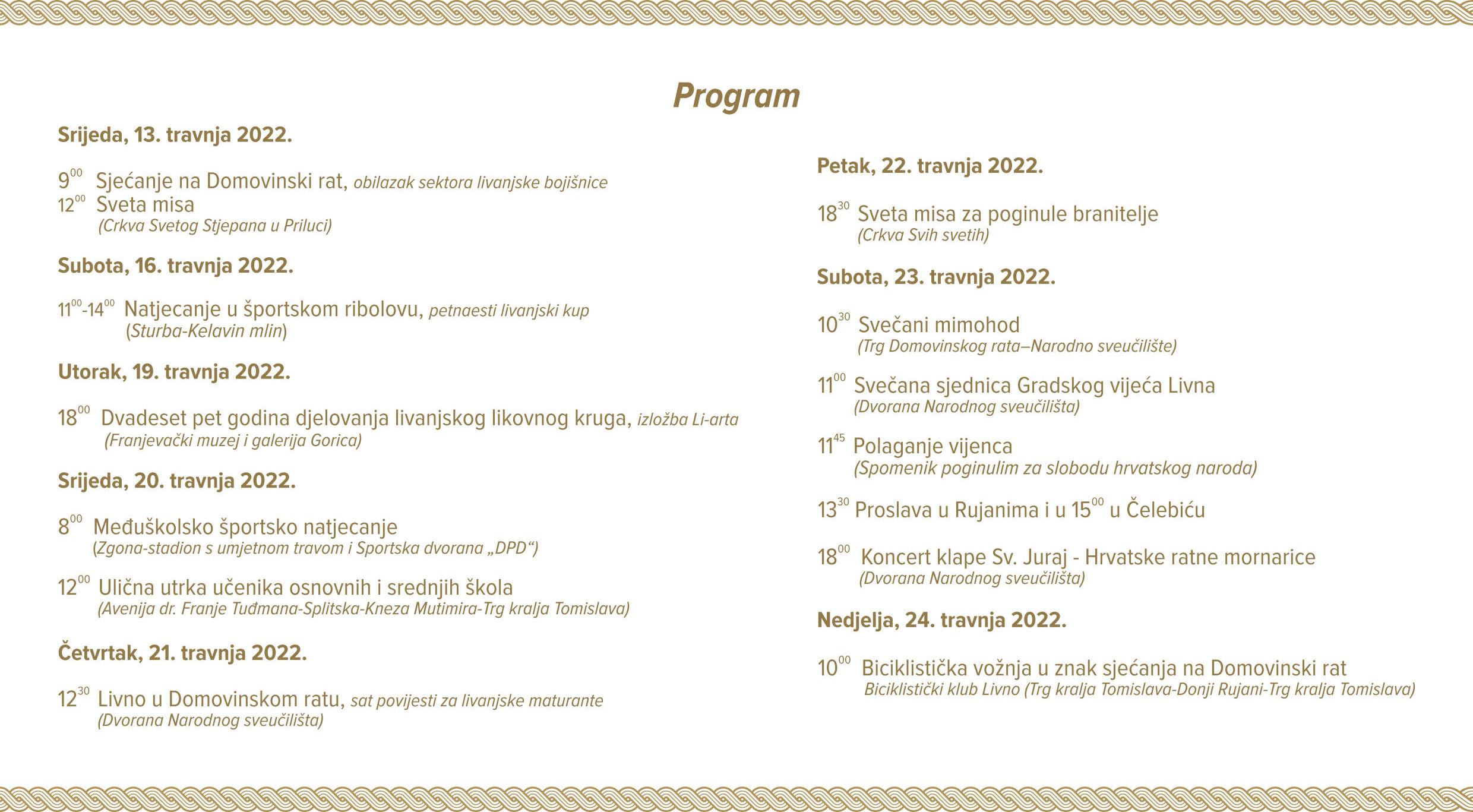 Program proslave bit će nastavljen u subotu 16. travnja petnaestim livanjskim kupom natjecanja u športskom ribolovu. Izložba Li-arta – dvadeset pet godina djelovanja livanjskog likovnog kruga je u utorak 19. Travnja u 18 sati u franjevačkom muzeju, a međuškolsko sportsko natjecanje je u srijedu 20. travnja. Livanjskim maturantima bit će održan sat povijesti Livno u Domovinskom ratu u četvrtak 21., a sveta misa za poginule branitelje je u župnoj crkvi Svih svetih u petak 22. travnja u 18 i 30. Središnja svečanost proslave na 23. travnja započet će mimohodom od Trga Domovinskog rata prema Narodnom svučilištu gdje će u 11 sati zapoočeti svečana sjednica Gradskog vijeća Livna nakon koje je predviđeno polaganje vijenca i paljenje svijeća. Proslava će se, uz prigodan program, nastaviti u Rujanima i Čelebiću uz služenje svetih misa. U 18 sati u kino dvorani Narodnog sveučilišta klapa Sv. Juraj-Hrvatske ratne mornarice održat će koncert. Članovi biciklističkog kluba Livno vožnju u znak sjećanja na travanjska događanja vozit će u nedjelju 24. travnja. Krenut će s Trga kralja Tomislava prema Rujanima. Raspisan je i natječaj za najbolje likovne i literarne radove učenika osnovnih i srednjih škola o temi „Suncem obasjano Livno“ od kojih će najbolji biti nagrađeni. Kompletan program proslave 30. obljetnice obrane Livna je u privitku.
